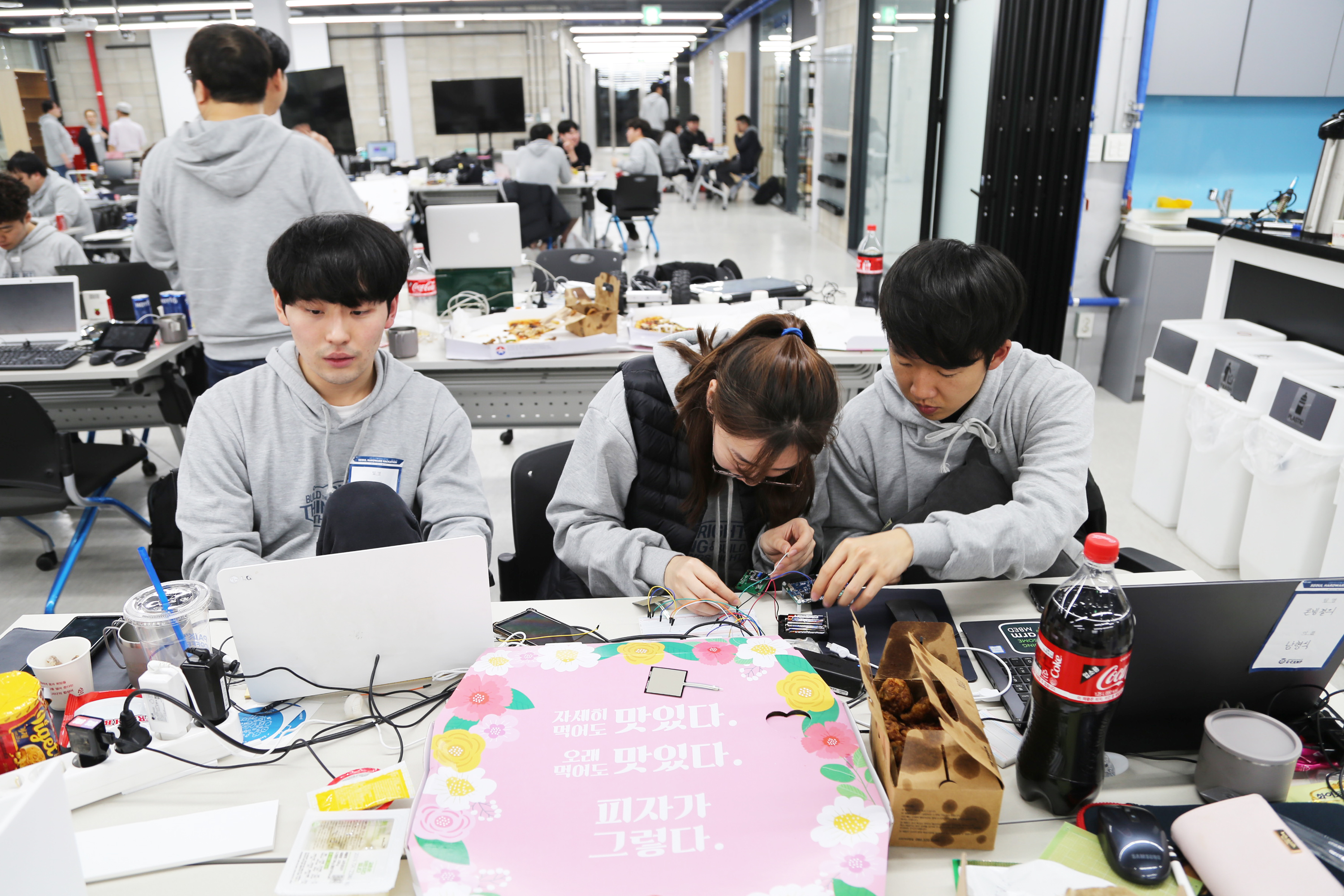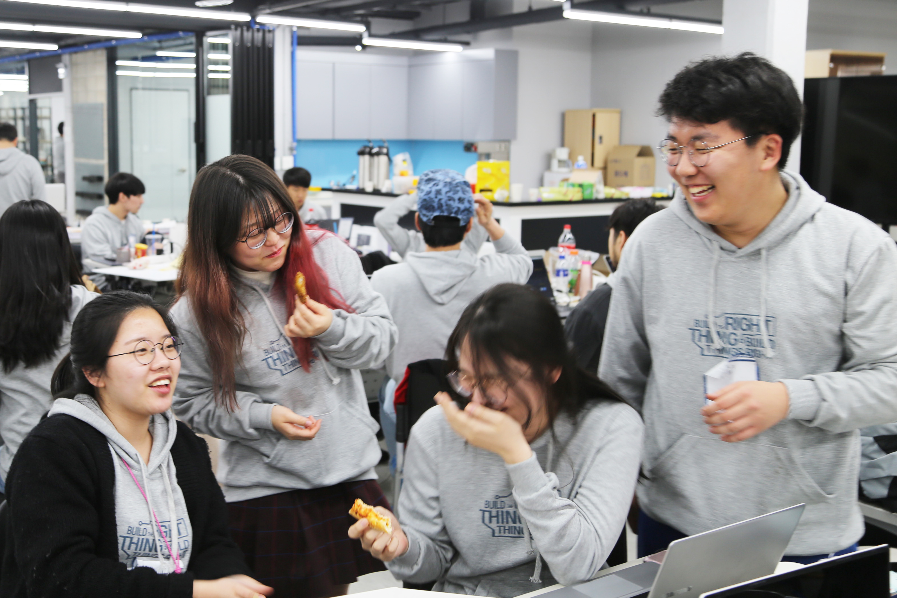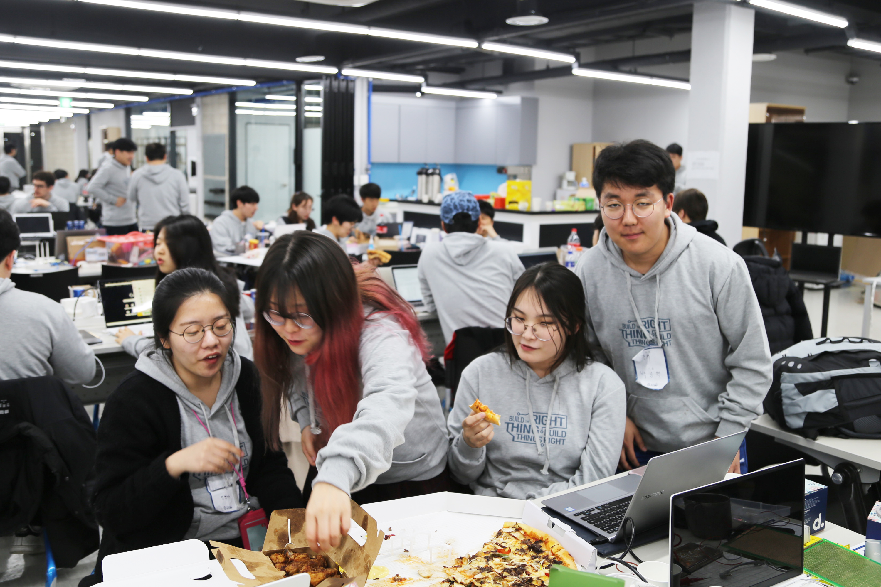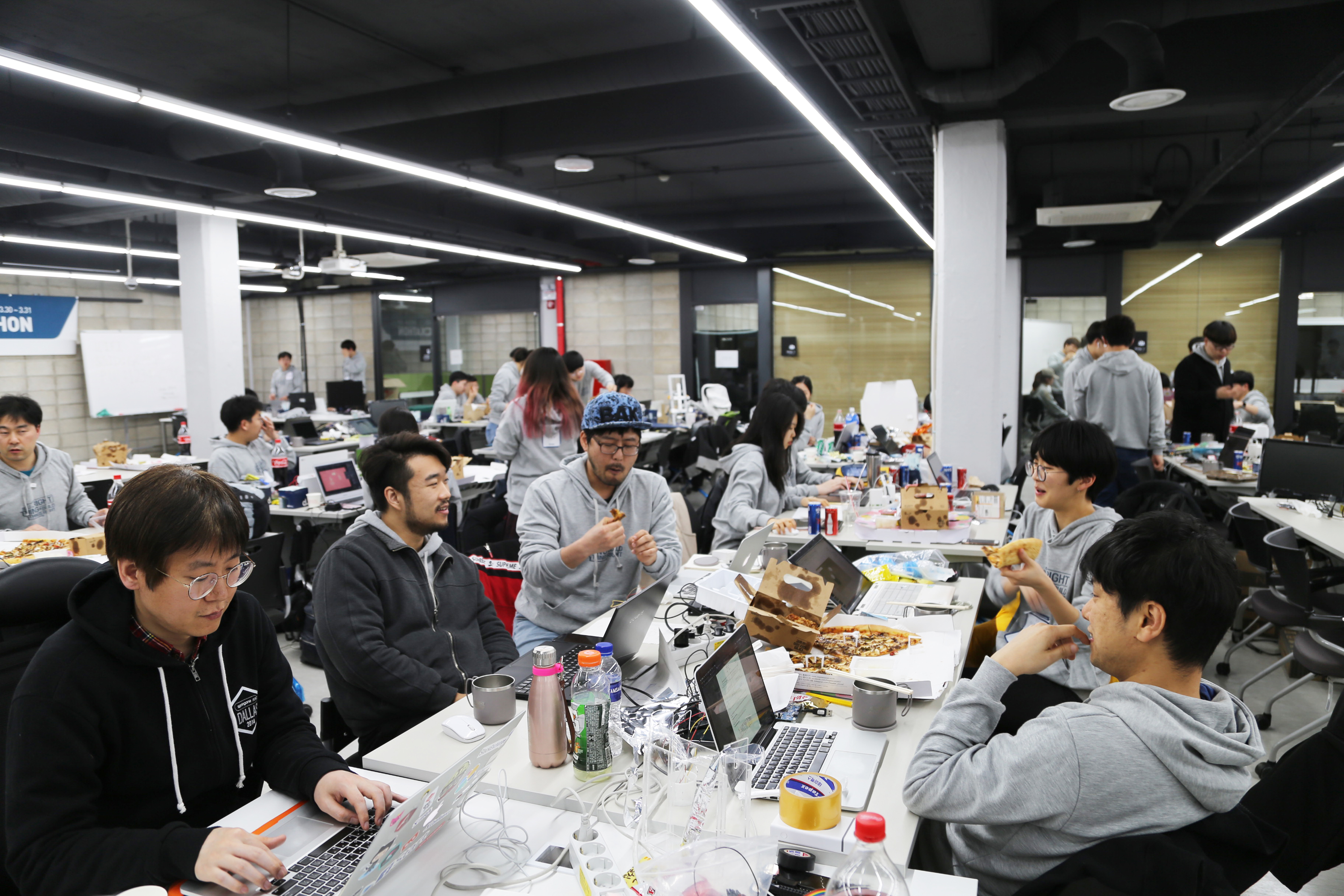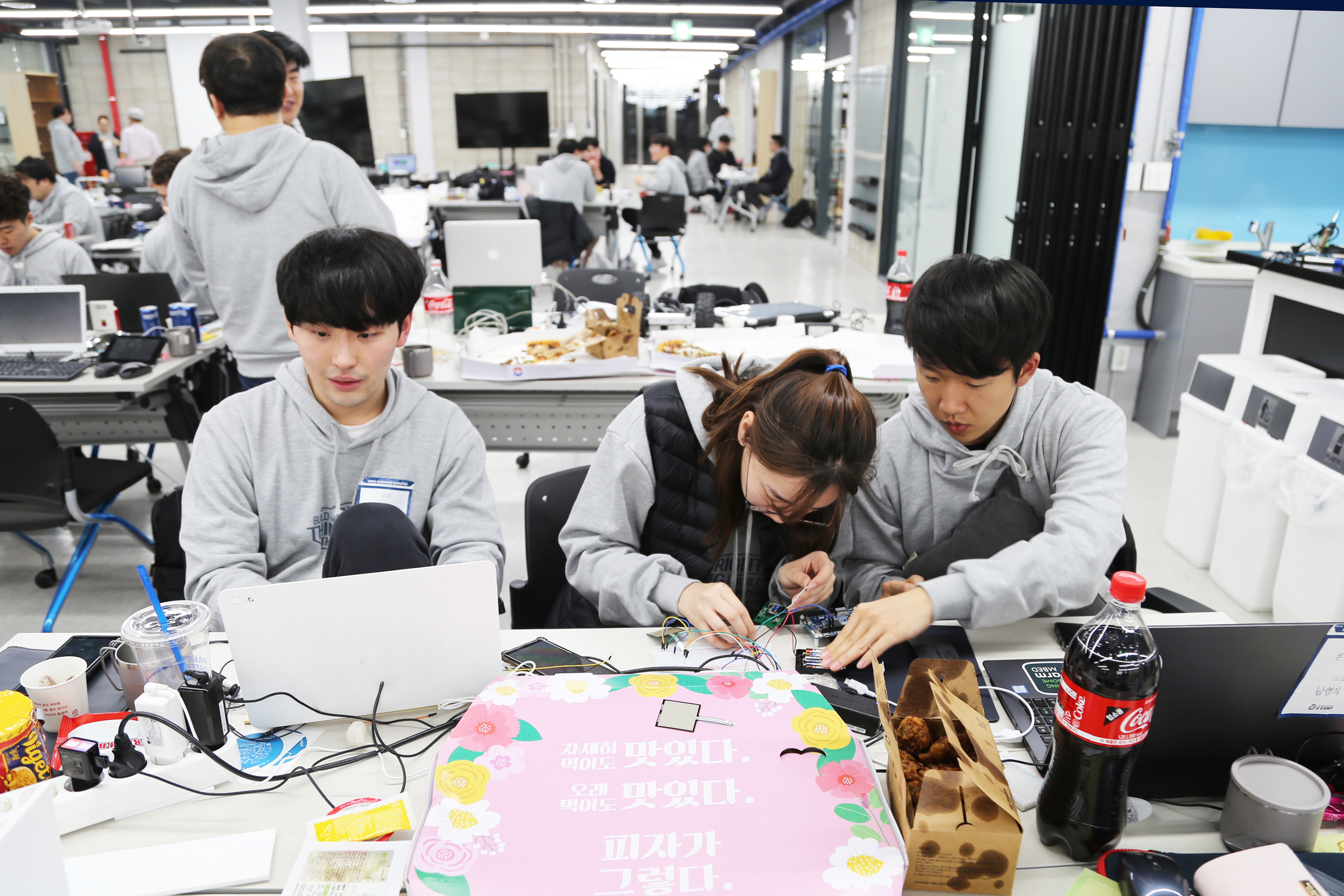 서울하드웨어 해커톤에서 개발하고 있는 장면입니다. 개발을 좋아하는 사람들의 놀이터이고 싶습니다.