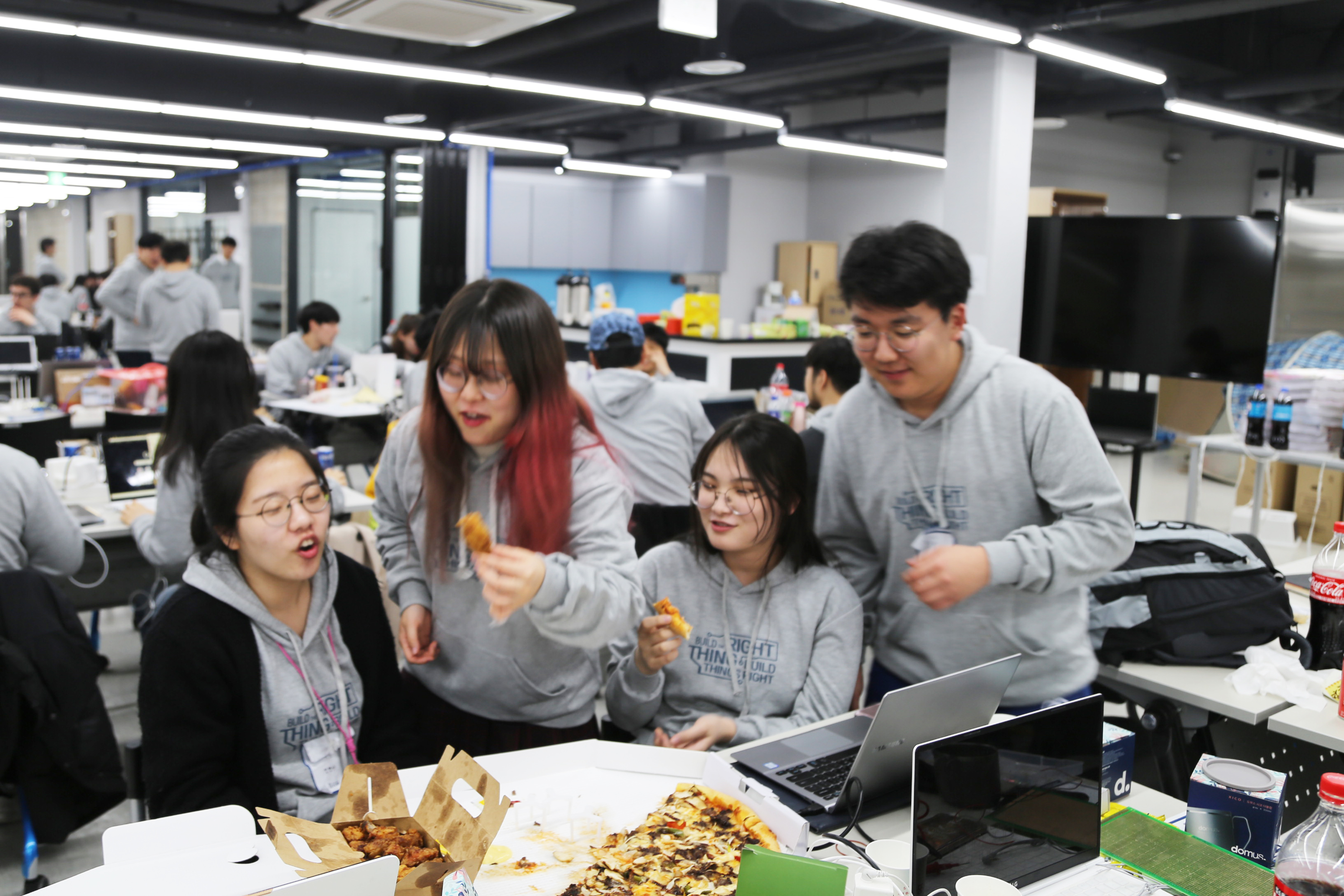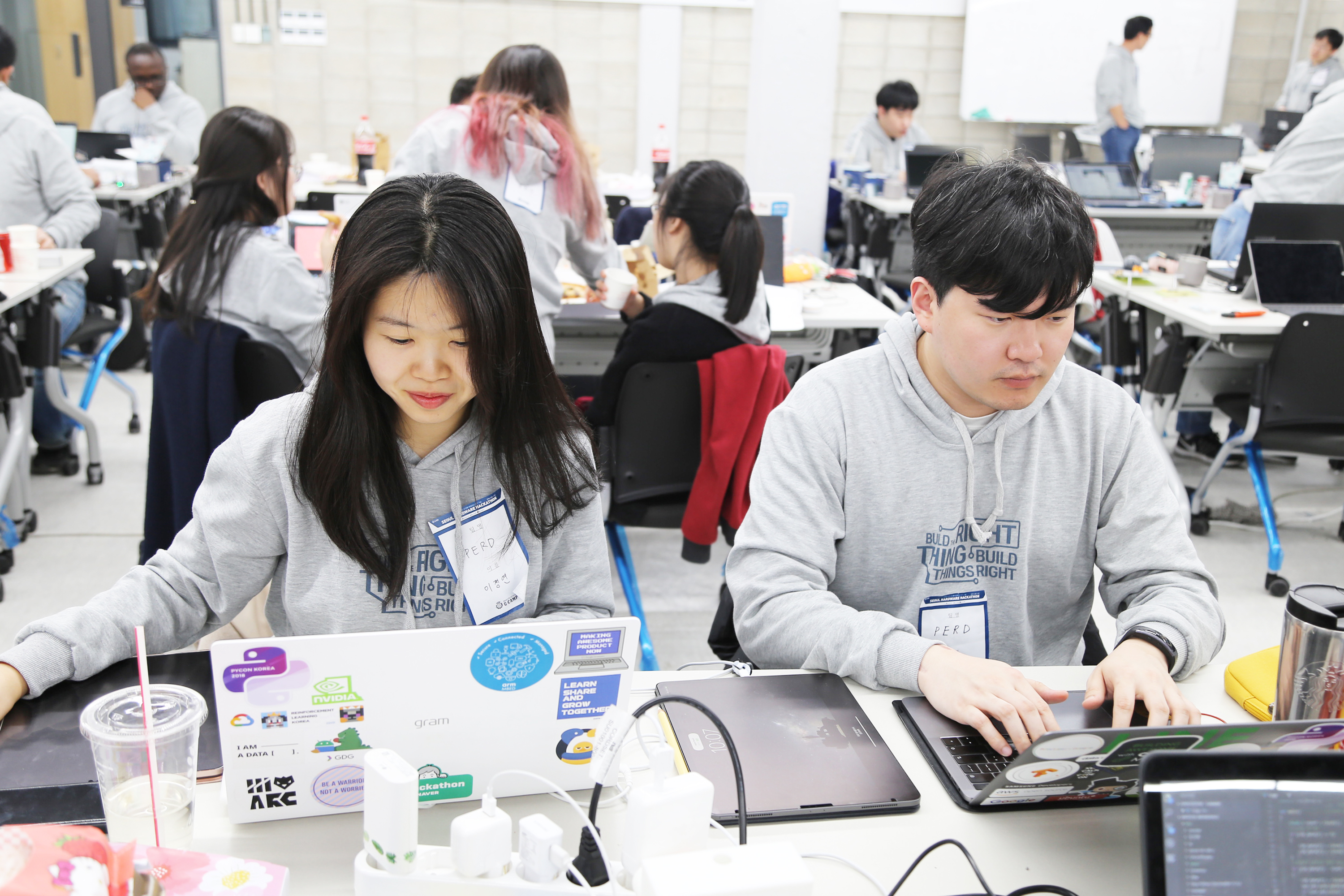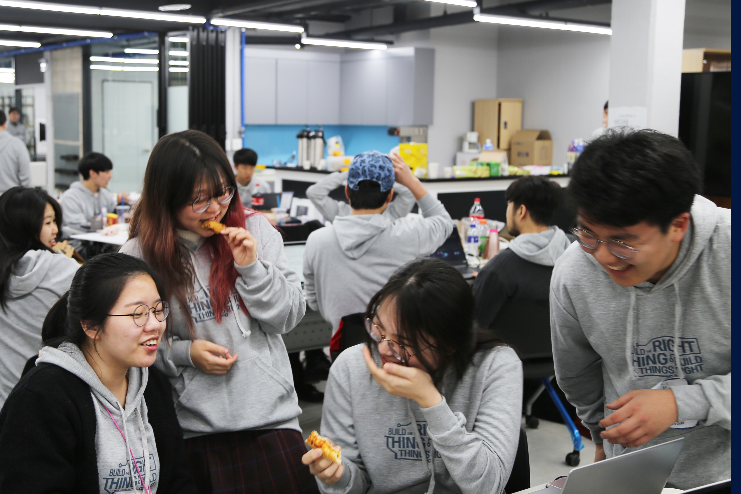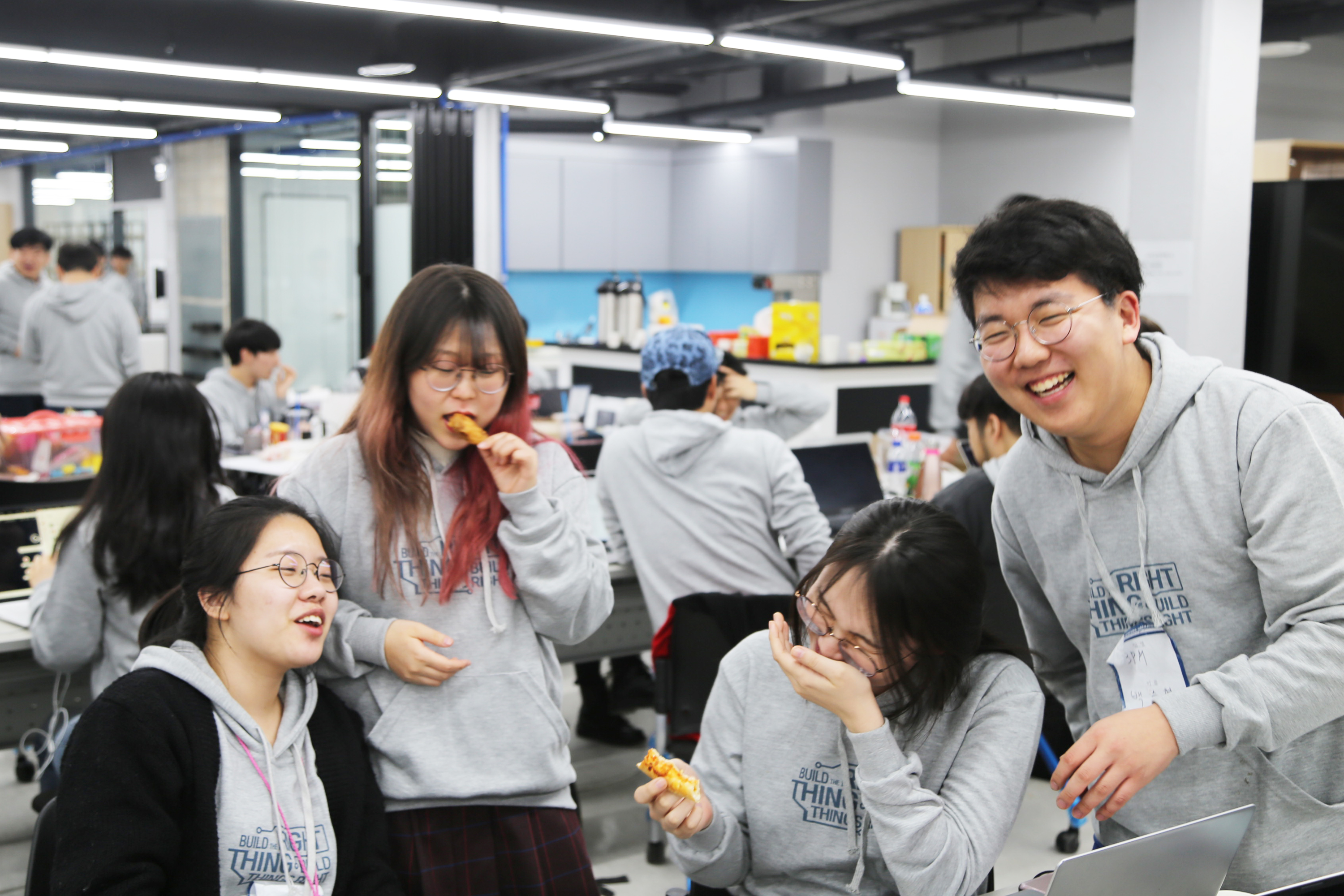 서울하드웨어 해커톤에서 개발하고 있는 장면입니다. 개발을 좋아하는 사람들의 놀이터이고 싶습니다.