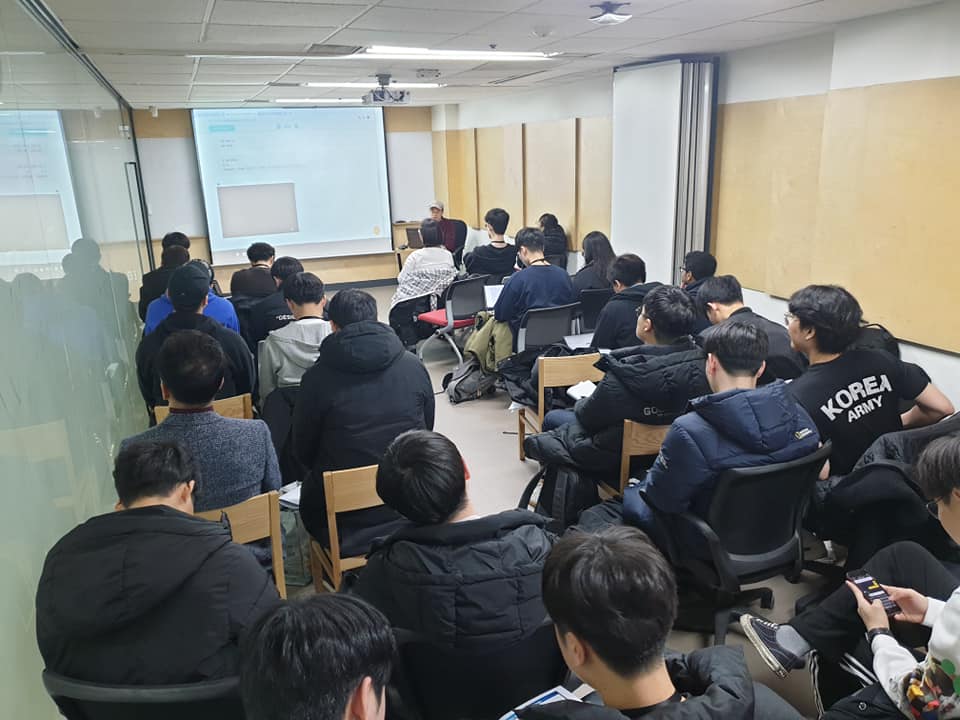 아이디어룸에서 참가자들을 대상으로 간단하게 워크숍을 진행하였습니다. 세로로 길쭉한 방이었습니다.